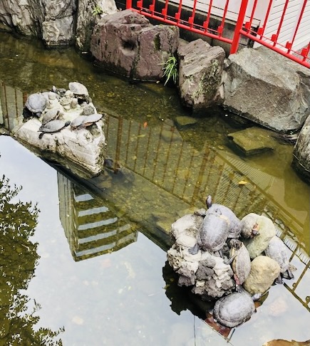 節分の時には池の底に潜っていた亀たちがのんびり天日干し。こうした光景がビルの谷間にひっそり繰り広げられています。弁財天のご案内にも常勝寺住職の読経の中にも平和のフレーズがあって、今の世界情勢などを考えると胸に響きます。人間も亀も平和じゃないと生きられない。今週は地域の方と国会前行動に参加します!
