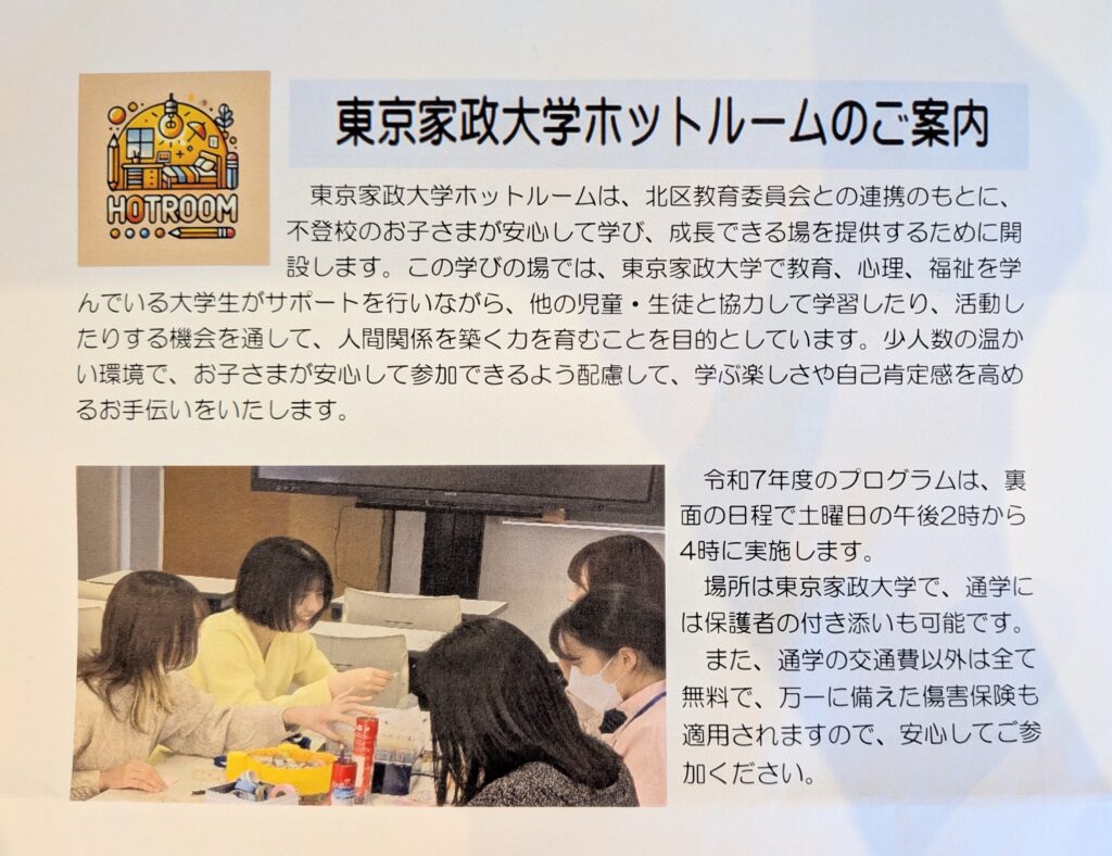 9月27日(土)宇都宮ゆり議員と一緒に、北区教育委員会が東京家政大学と連携して開設している「#東京家政大学ホットルーム」をお訪ねしました。