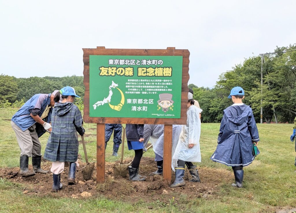 「植樹のやり方、伐採の方法を知り、工作したりと、普通のくらしではじめての体験をしたり、木や森にかかわっている人への意識をもってくれた。ここ23区でくらしていることと切り離さないで、自分たちのくらしの中で気にしてほしい」「木が育つことに30年40年もかかる。空間や時間に意識が向いたことを忘れないでほしい」「木を植えたことで、心に何かうわったものがあった。大切にしてほしい」と。