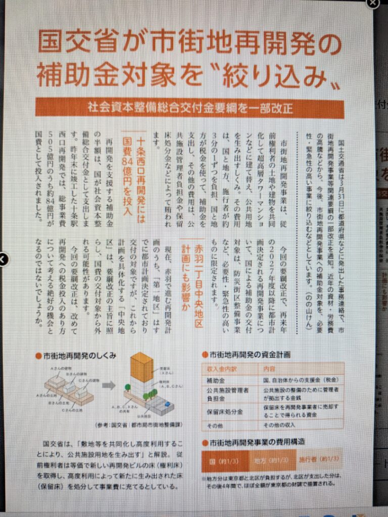 東京一極集中をさらに加速し、異常な家賃高騰を引き起こしている首都圏のタワーマンション建設は、各地で行き詰まりに直面しています。ところが北区では、赤羽、王子の駅周辺まちづくりで、市街地再開発計画を推し進めています。