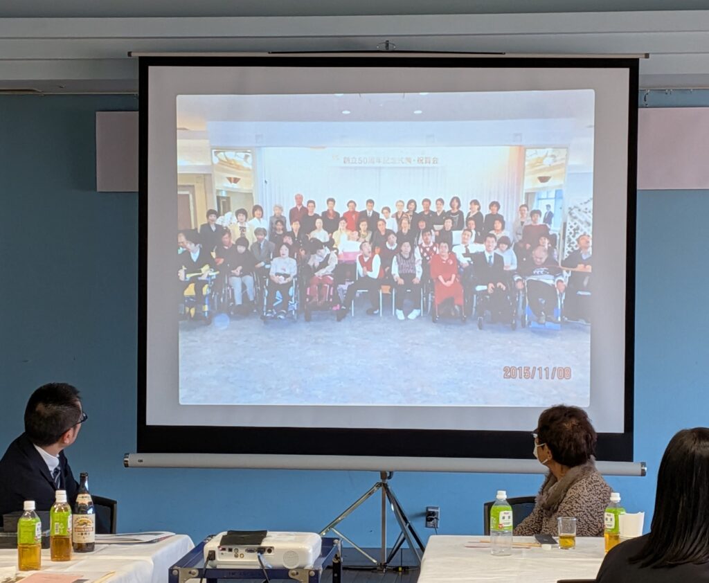 会長より「創立は昭和40年。障害の重いこどもたちは教育を受ける権利もなかった時代。手足の不自由な子どもを背中におぶり、病院や療育に通い、全員就学運動など要請をしてきた。