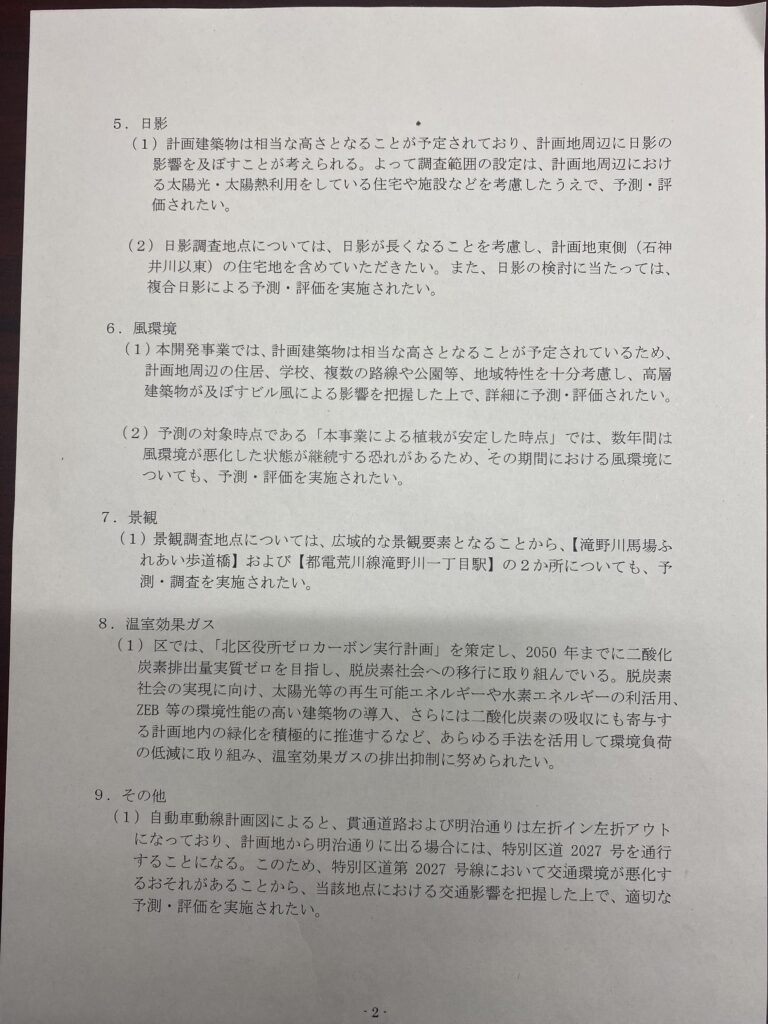 景観の影響で、北とぴあ展望ロビーからのビューや、名主の滝公園再整備で、展望デッキも計画されている地点も加えるよう求める。