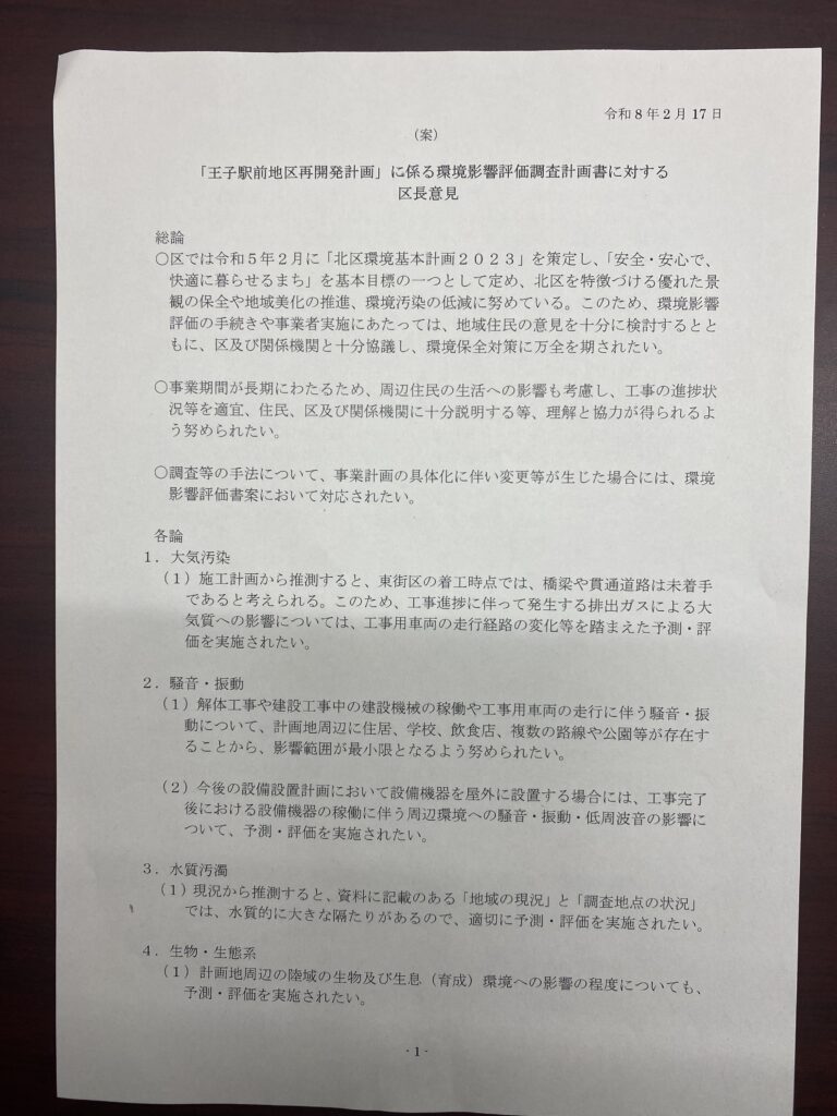 2月17日(火)、北区環境審議会にて、王子駅前地区再開発計画の環境影響評価調査計画書が審議されました。