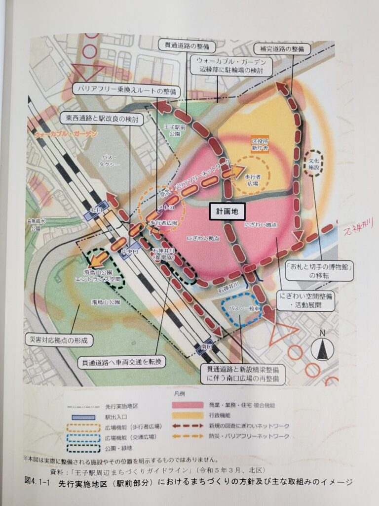 計画地はJR京浜東北線、東京メトロ南北線が乗り入れる王子駅に近接し、令和5年3月「王子駅周辺まちづくりガイドライン」の中で、王子駅まちづくりの整備計画の「先行実施地区」に位置づけられ、駅前にぎわい拠点の誘導、南口広場の再整備、北区役所新庁舎(予定)と連携した災害対応拠点の形成などの取り組みや、歩行者が快適さえを感じ、回遊性を高める「ウオーかブル・ガーデン」や「コネクティング・コア」に位置づけられている。