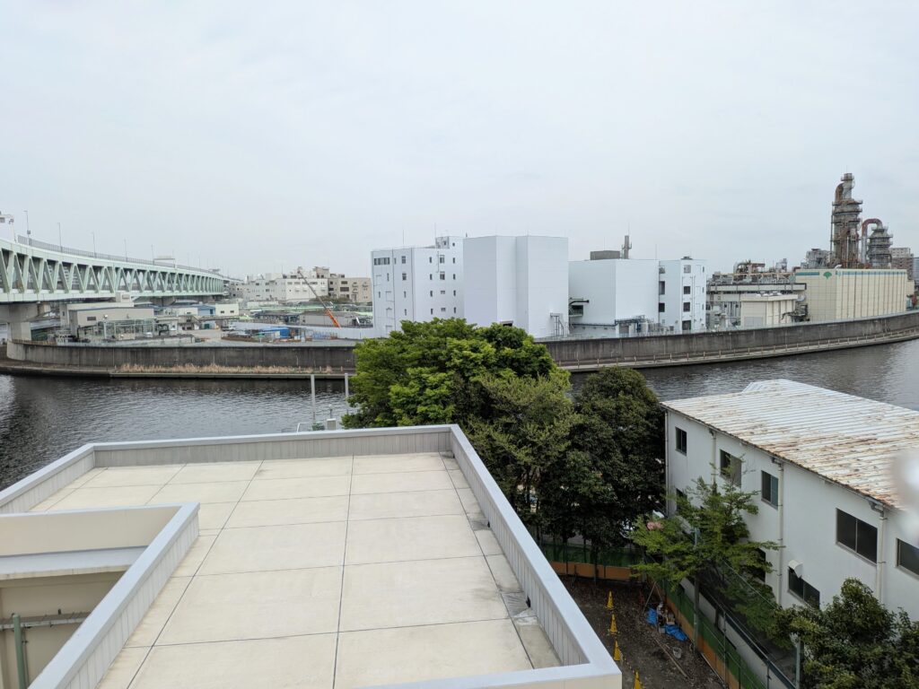 手前が貯留施設。左横の石神井川口。対岸手前は隅田川。対岸中央がみやぎ水再生センター。