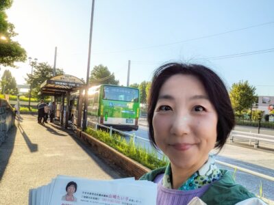9月24日(水)、今朝は豊島5丁目団地バス停より、区政レポートをお届けしながらご挨拶。 団地内ガーデンに咲いている花も沈丁花に秋桜とすっかり秋に〜😊 ラジオ体操に来ている皆様とは、都の省エネエアコン助 …
