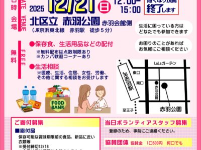 12月21日(日)午前中は、赤羽公園で実施する「年越したすけあいフェス」(実行委員会主催)の準備をお手伝い。 テントを立てて、食料品や雑貨品、衣類などのフリーマーケットを用意をしている間に、待ってい方 …